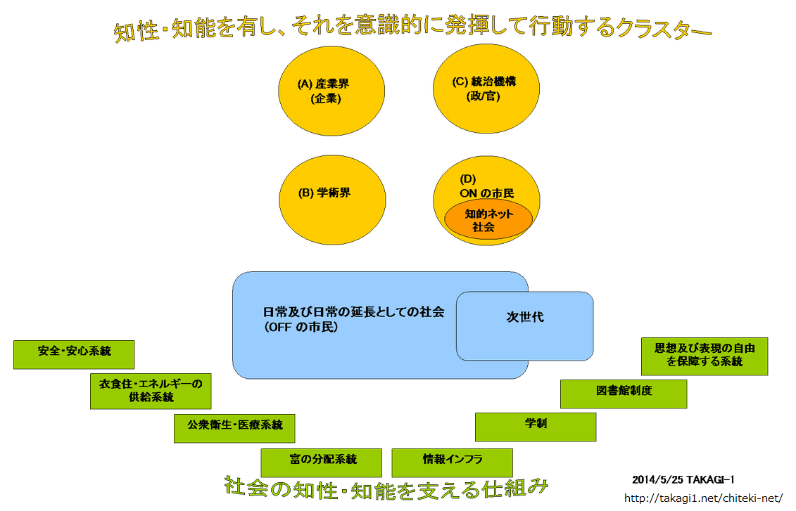 知的ネット社会は、〈ONな市民〉に含まれる、ひとつの場です。なお、〈ONな市民〉とは、〈産業界 (産)〉・〈学術界 (学)〉・〈統治機構 (政・官)〉と同じく、知能・知性を有し、それを意識的に発揮して行動するクラスターのひとつです。