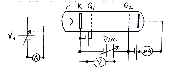 図 1のようにネオンを封入した4極管でカソード Kより放出される電子をグリッドG1,G2間で加速する。加速電圧VACCを 0 V から増していくと、最初、電子はネオン原子と衝突してもほとんどそのエネルギーを失うことは無くプレーとPに到達する。このときKから引き出される電流は単調に増大する。ただし、Pに約