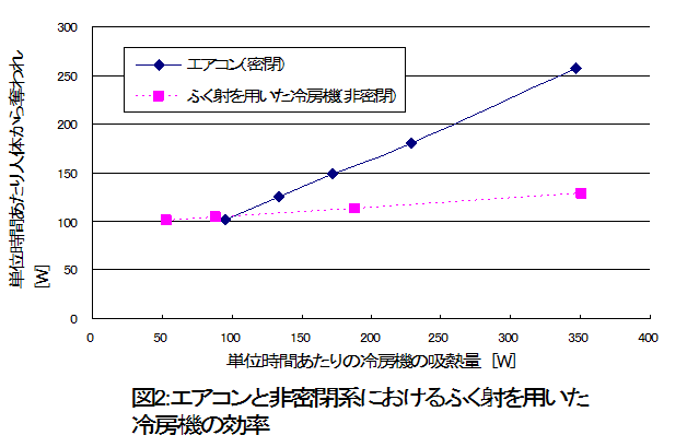 冷房機による単位時間あたりの吸熱量が大きくなると、ふく射を用いた冷房機の効率はエアコンより下がる。これは、ふく射を用いた冷房機で冷房する場合のTwがエアコンで冷房する場合のTw よりも低いために、前者の場合において後者の場合よりも、多くの外部の熱を内壁が吸収しているためであると考えられる。