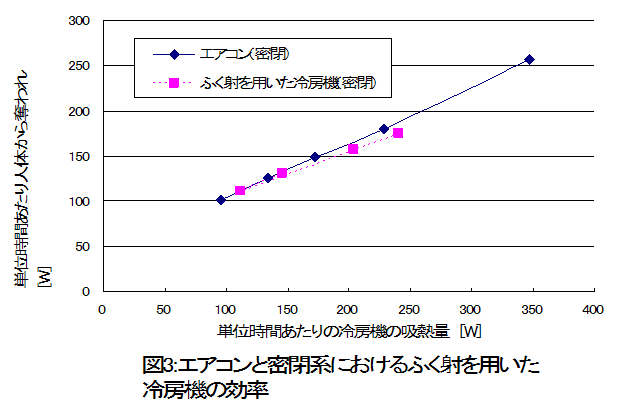 図3より、空気が密閉された部屋において、エアコンとふく射を用いた冷房機の効率はほぼ同じである。