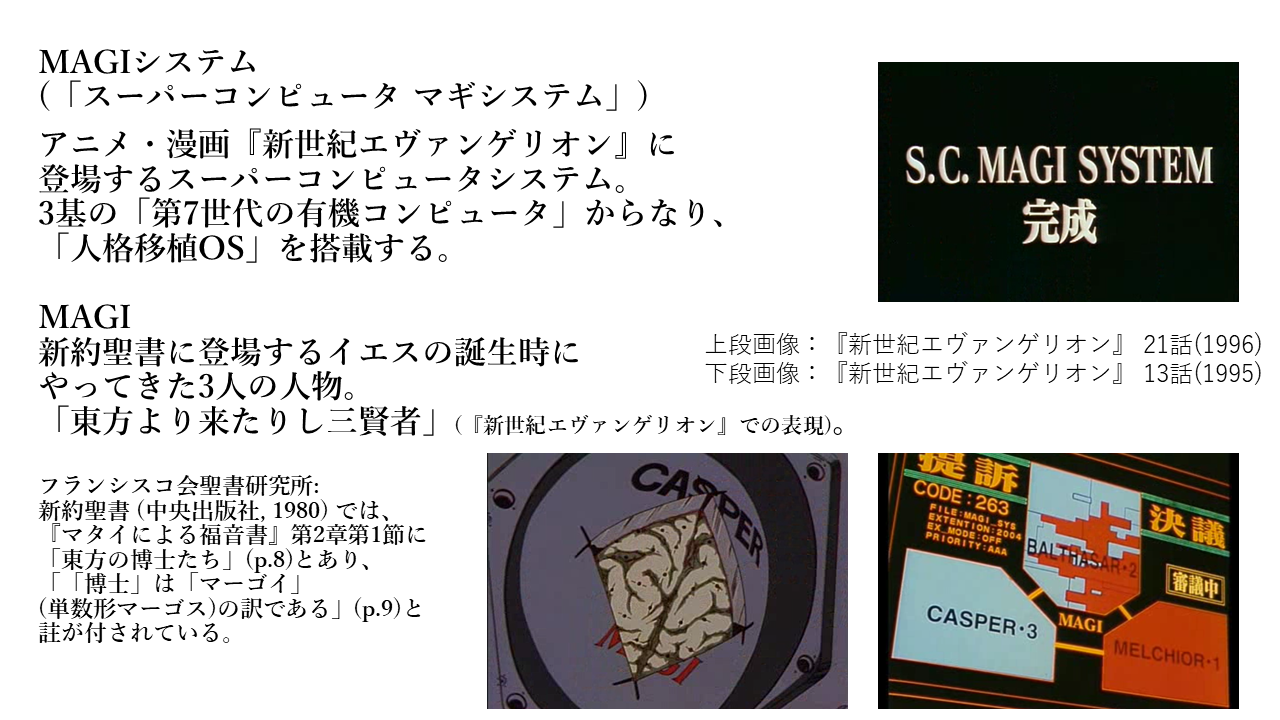 新約聖書に登場するイエスの誕生時にやってきた3人の人物。「東方より来たりし三賢者」(『新世紀エヴァンゲリオン』での表現)。