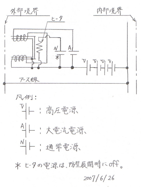 高圧電源 : 高電圧を生じさせる電源装置(静電気発生器)。遮断器や制御回路を