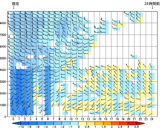 > ・縦軸は高度(m) 横軸は時間(h)です。 > ・左端が最新の情報です。右にいくほど過去になります。 > ・1時間毎の水平風(m/s)を24時間分、矢羽で表示しています。 > ・長い矢羽は10m/s、短い矢羽は5m/sを表します。 > ・鉛直流(m/s)を色で表示しています。暖色系になるほど上昇流が強く、 > 寒色系になるほど下降流が強いことを示します。 戻る