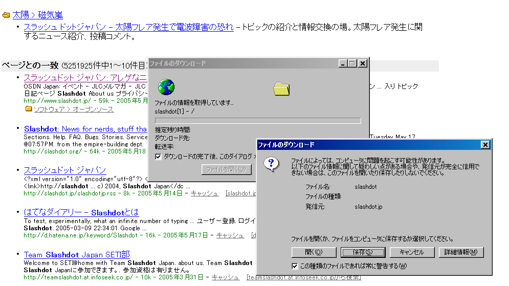 「スラッシュドット ジャパン」を見ようとしてダウンロードアラートが表示 されてしまう場合の対処法はこちら。 http://www.h5.dion.ne.jp/~wing-x/ezhtml/ezh/id_0505010.html#200505280 −移転→ http://takagi1.net/ezhtml/ezh/id_0505010.html#200505280