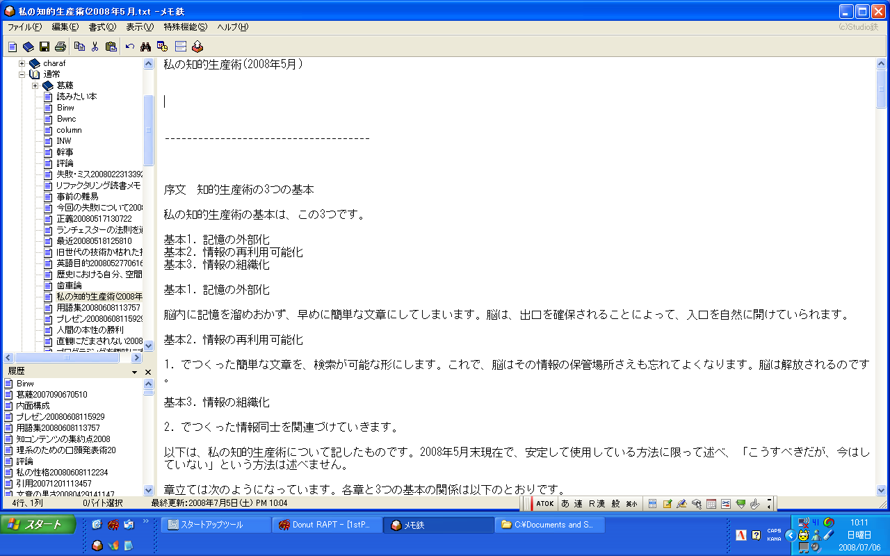 ここでは、複数の内容を1つのテキストファイルに記載しています。梅棹 忠夫「知的生産の技術」において良くないものだとされている「大学ノート方式」がとられているわけですが、紙の大学ノートとは異なり、切り取り・貼り付けが自由にできるために、文章を徐々に生成する場になっています。