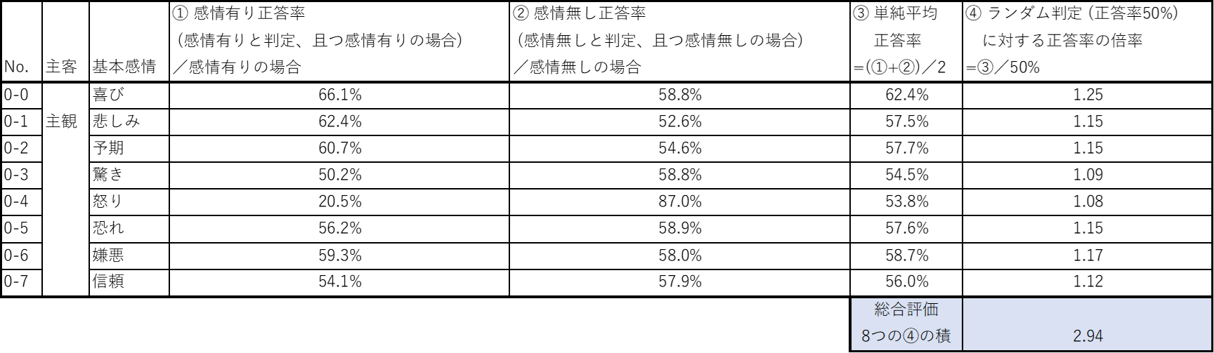 基本8感情それぞれの、感情有りの場合の正答率(条件付き確率)と感情無しの場合の正答率(条件付き確率)の単純平均値を、ランダム判定での正答率 50%と比較した後、基本8感情について積を計算することで総合評価をしました。