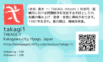 TAKAGI-1は、社会内・組織内における問題解決を改良する手段としての、知識の積み上げ・発信・受信に興味があります。